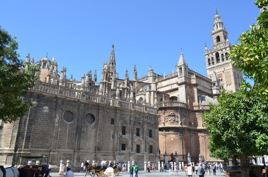 Katedra Najświętszej Marii Panny i Giralda – zjawiskowa katedra gotycka, która powstała w miejscu meczetu. Giralda to dzwonnica katedry, która wcześniej była minaretem. Minaret to w meczecie wysoka wieża.